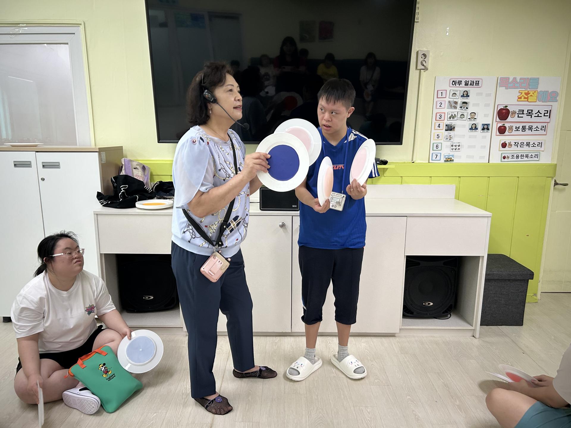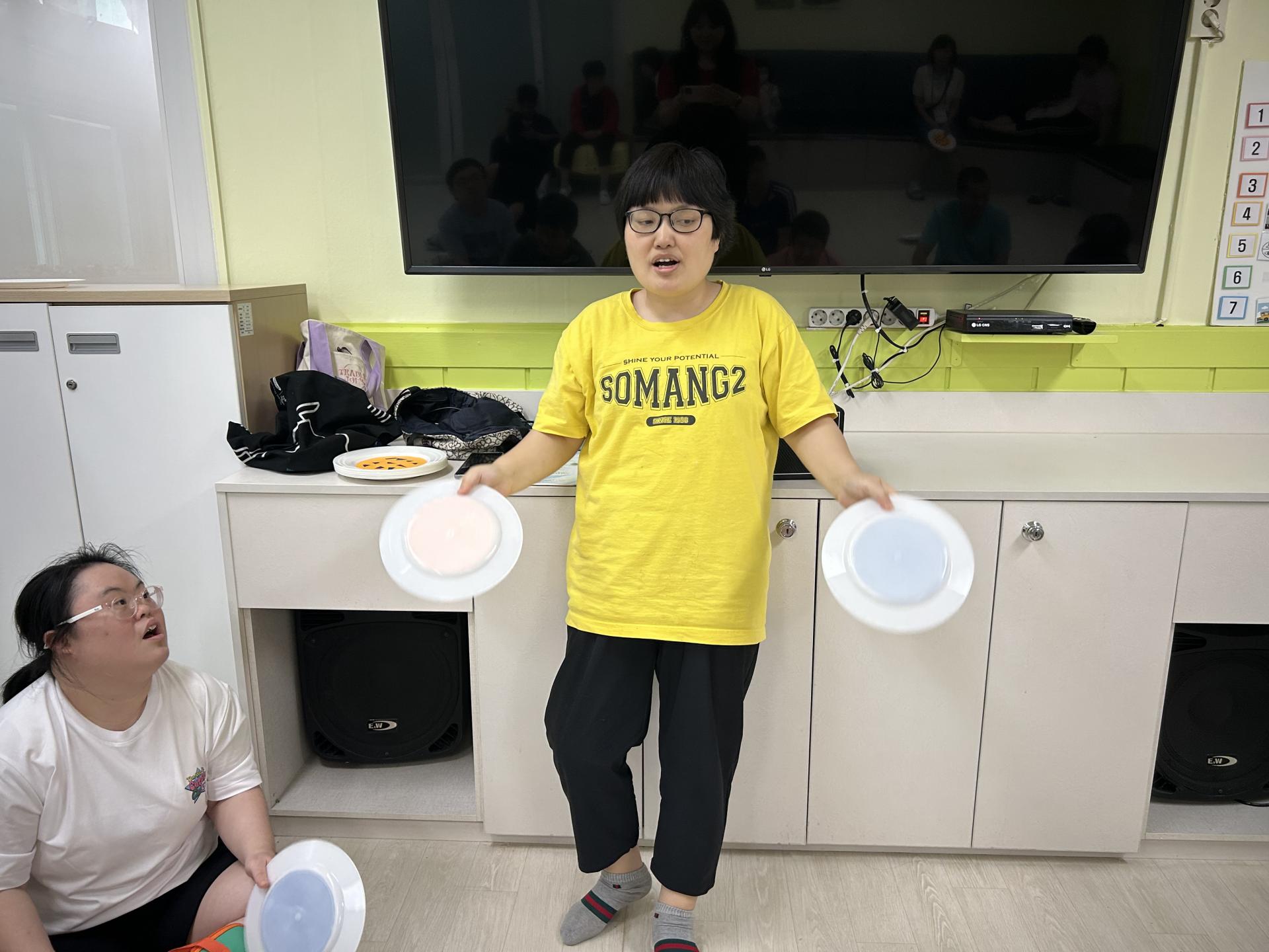 일회용 접시를 이용하여 체조와 연주를 해보았구요.