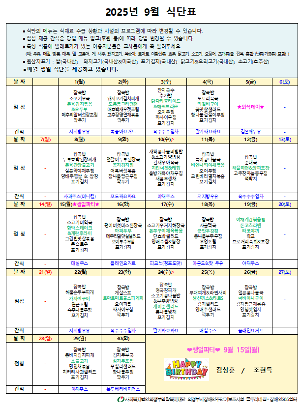 2025년 9월 식단표