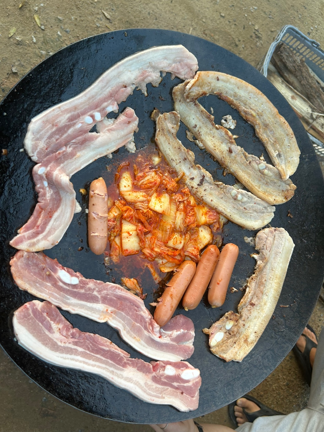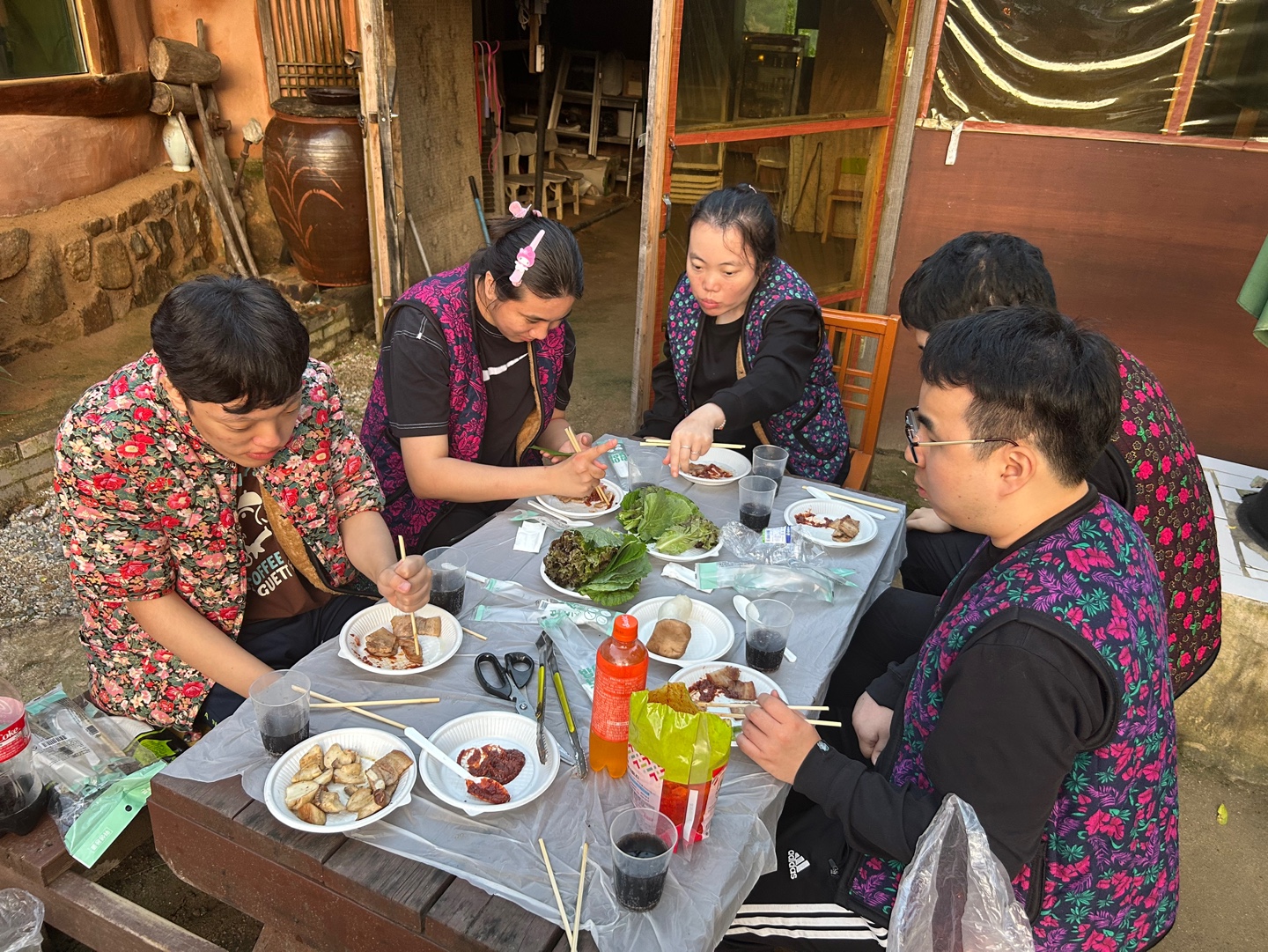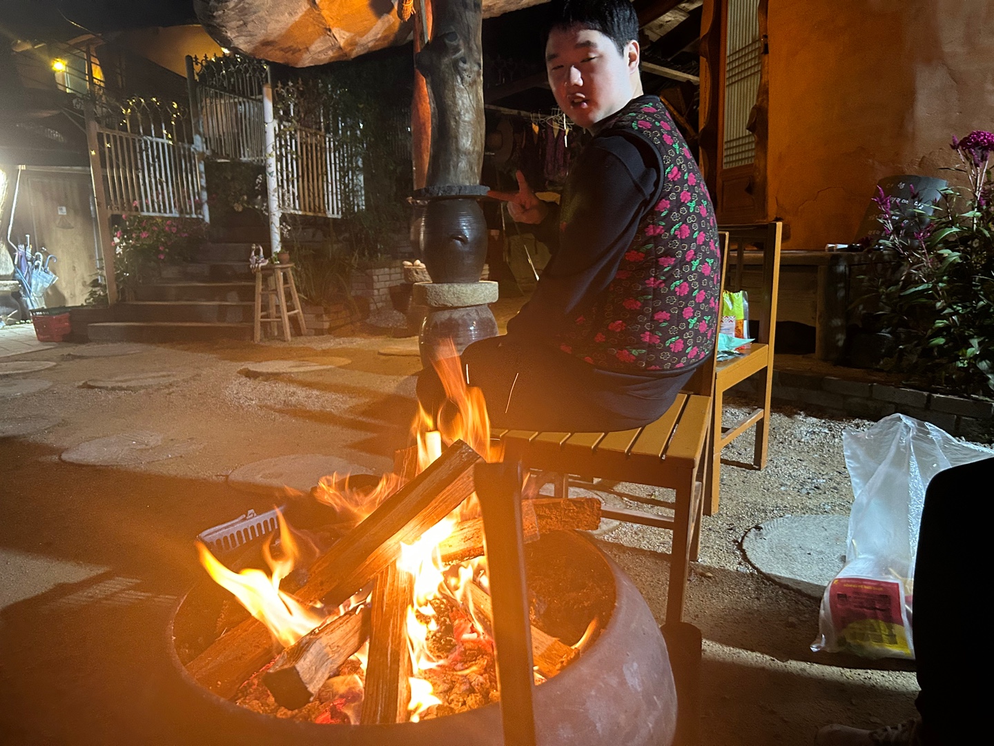 요즘 유행인 꽃무늬 조끼까지 입고 장작불을 지피며 즐거운 추억을 쌓고 왔습니다^^